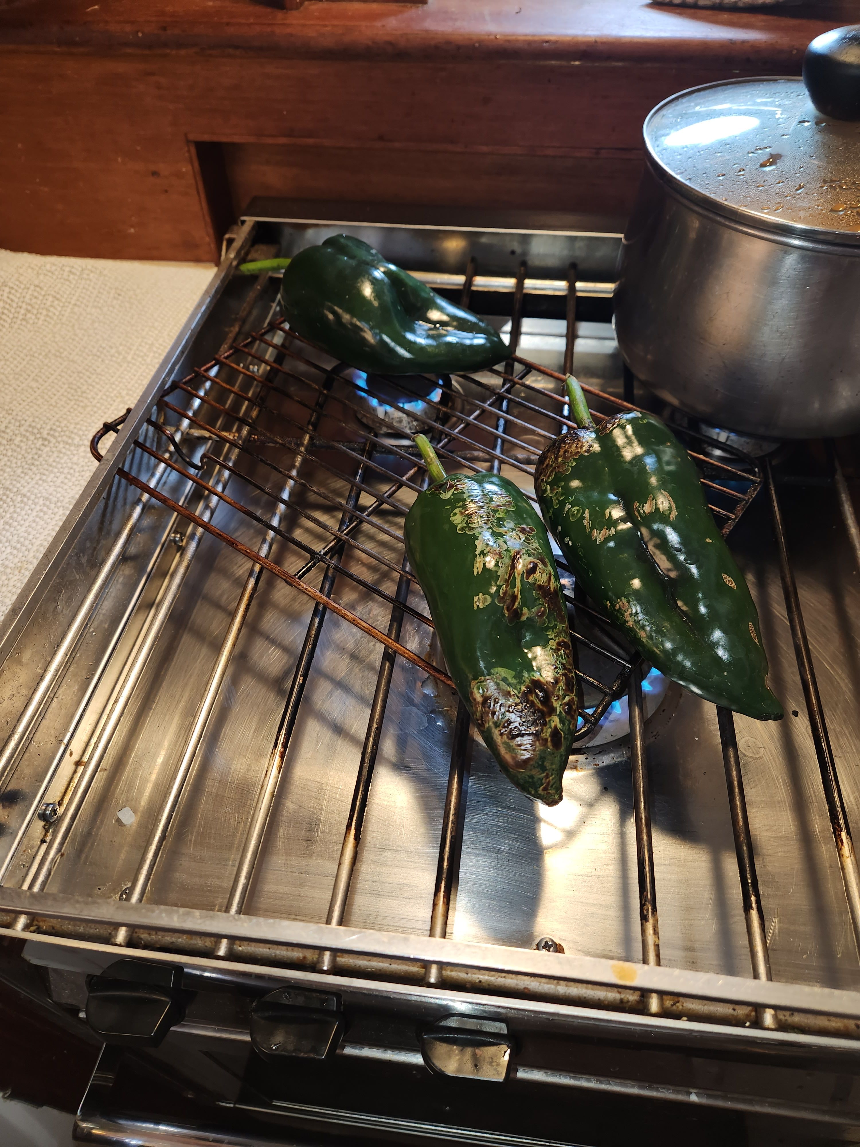 After blistering, place the peppers in a large ziplock bag or covered pan. Allow them to steam on their own for about three minutes.